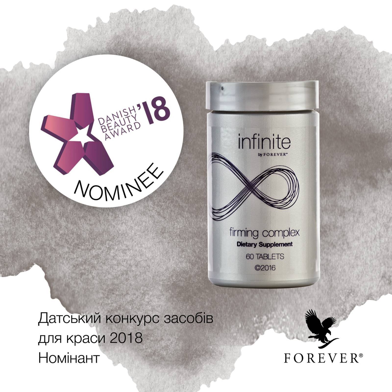 Зупиніть старіння зсередини. Краса – це більше, ніж просто догляд за шкірою, вона починається з правильного харчування. Даний продукт компанії Форевер – це перша ексклюзивна косметична добавка, яка допоможе вам контролювати процес старіння. Дві маленькі таблетки без покриття, прийняті щодня, підтримують внутрішні органи і системи, а також загальний стан вашого здоров’я і зовнішній вигляд. Згідно результатів двох клінічних досліджень французька диня містить супероксиддисмутазу, ключовий інгредієнт антиоксидантної системи, що допомагає боротися зі стресом від вільних радикалів. Запатентовані фітокераміди, взяті з європейської пшениці, доповнюють ключові компоненти, які природним чином містяться в шкірі та відіграють вирішальну роль в її захисті та зволоженні. Пероральний прийом колагену зменшує глибину і кількість зморшок на обличчі, покращує зволоження, гнучкість і еластичність шкіри. Нарешті, вітамін С допомагає зменшити втому, а також сприяє нормальному утворенню колагену. Краса зсередини – революційне рішення в антивіковій системі догляду за шкірою. Зміцнюючий комплекс Інфініт від Форевер не містить глютену і працює разом зі Зміцнюючою Сироваткою і іншими актуальними продуктами лінійки Форевер. Переваги • Косметичний засіб, який зберігає і підтримує молодість шкіри зсередини і зовні • Зменшує появу зморшок, підвищує пружність і зволоження шкіри • Допомагає функціонуванню різних систем організму і підтримує загальну енергію • Не містить глютену • Підходить для вегетаріанців ВМІСТ УПАКОВКИ 60 таблеток